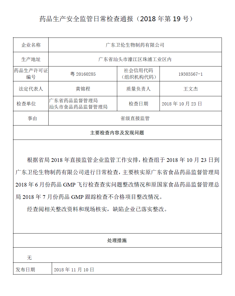 药品生产安全监管日常检查通报(2018年第19号)