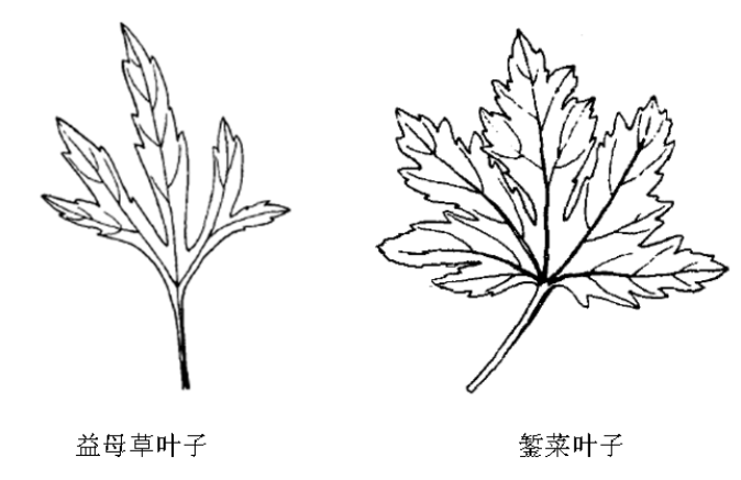 錾菜与益母草可从叶片进行区别,益母草叶深裂达基部而成三个窄裂片,在窄裂片上再分裂成羽状小裂片;錾菜叶裂片宽大,边缘有缺刻或呈粗锯齿状,不再分裂为小裂片。