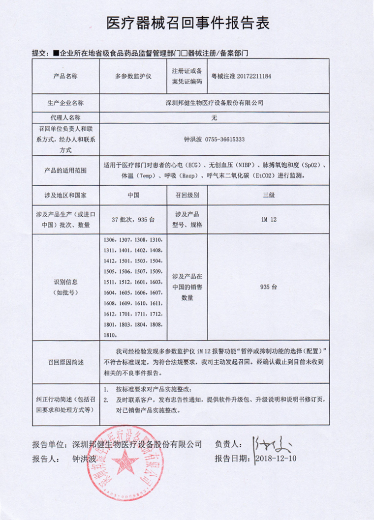 深圳邦健生物医疗设备股份有限公司报告,该公司生产的多参数监护仪经检验,不符合标准规定。深圳邦健生物医疗设备股份有限公司主动召回有关产品,召回级别为三级。涉及产品的型号、规格及批次等详细信息见《医疗器械召回事件报告表》。