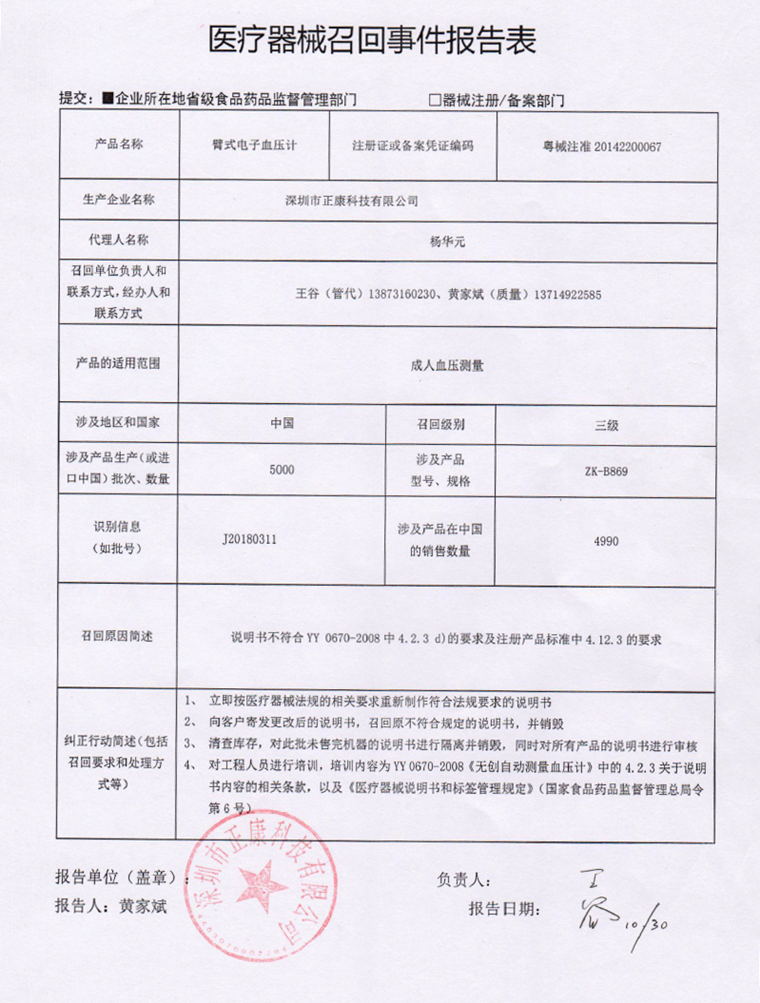 深圳市正康科技有限公司报告,该公司生产的臂式电子血压计经检验,不符合标准规定。深圳市正康科技有限公司主动召回有关产品,召回级别为三级。涉及产品的型号、规格及批次等详细信息见《医疗器械召回事件报告表》。