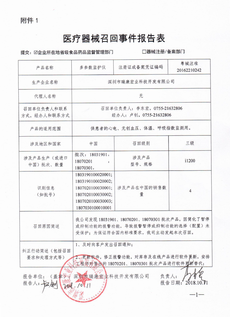 深圳市瑞康宏业科技开发有限公司报告,该公司生产的多参数监护仪经检验,不符合标准规定。深圳市瑞康宏业科技开发有限公司主动召回有关产品,召回级别为三级。涉及产品的型号、规格及批次等详细信息见《医疗器械召回事件报告表》。
