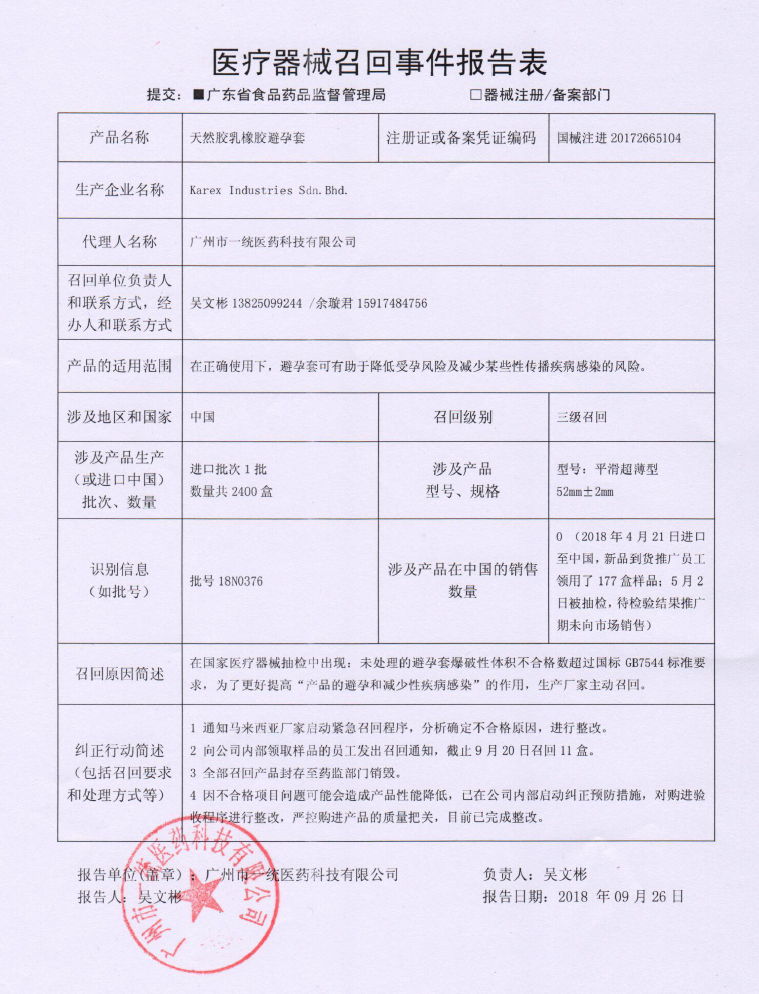 广州市一统医药科技有限公司报告,该公司经营的天然胶乳橡胶避孕套经检验,不符合标准规定。广州市一统医药科技有限公司主动召回有关产品,召回级别为三级。涉及产品的型号、规格及批次等详细信息见《医疗器械召回事件报告表》。