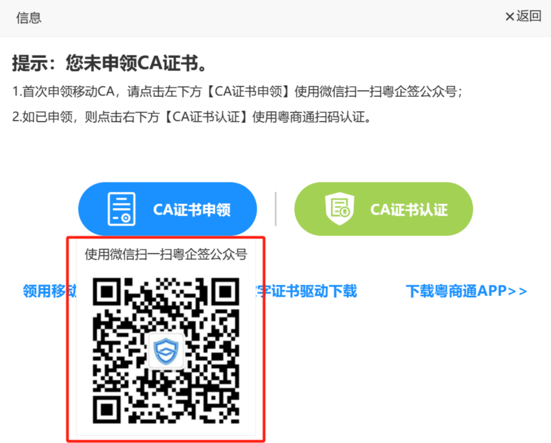 如已申领,则点击右下方【CA证书认证】使用粤商通扫码认证。